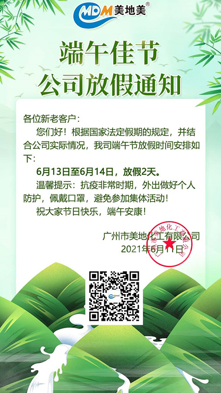 即將迎來端午佳節(jié),廣州市美地化工有限公司現(xiàn)就2021年端午節(jié)放假安排通知如下:2021年6月13日至6月14日放假,共2天。節(jié)日期間,希望大家提高防范意識,加強自我防護(hù)。出行期間佩戴好口罩,勤洗手,盡量減少外出逗留時間,少去人員密集場所,并準(zhǔn)備好健康碼,積極配合查驗和體溫檢測等工作。